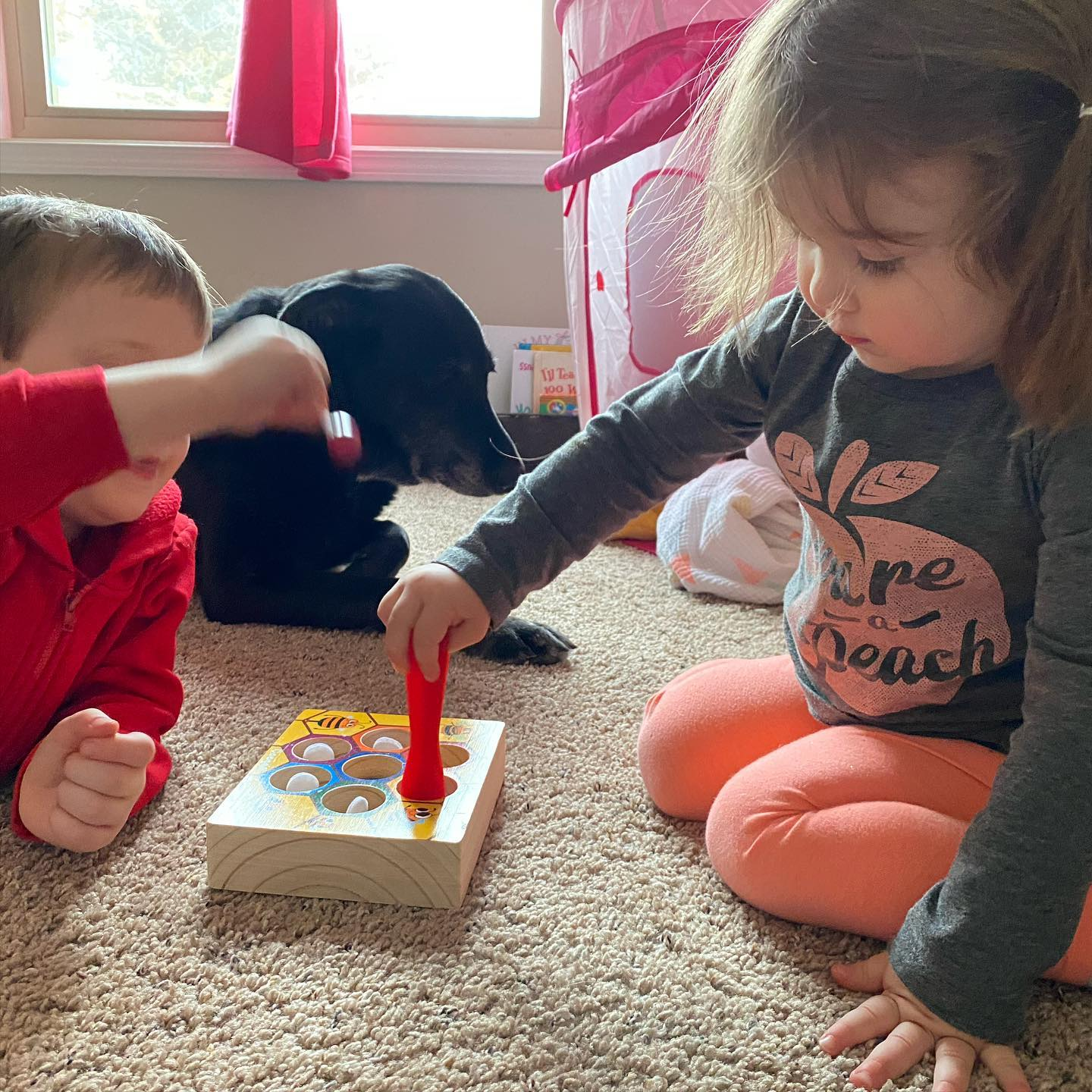 Every other month or so, {Grand}MamaK puts together a care package for the Grands. I look for fun, educational, seasonal, developmentally-appropriate things that they can enjoy. Things like books, puzzles, fine-motor skills activities, role play costumes, and Montessori style 'works'. Because while I enjoy a good movie night and sugary treats like most people, I want to be a grandma that feeds the whole child, not just their tummies. (I also don't want their parents to groan every time I send a package, LOL) One of this month's goodies is a pincer grip activity that is built around bees, which not only covers the spring theme, but goes along well with our little Thea B's nickname. Caden is really enjoying it and I am DELIGHTED!